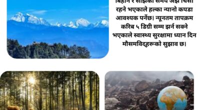 आज सोमबार काठमाडौं उपत्यकासहित देशका अधिकांश क्षेत्रमा मौसम सामान्यतया सफा रहने अनुमान गरिएको छ। बिहानको