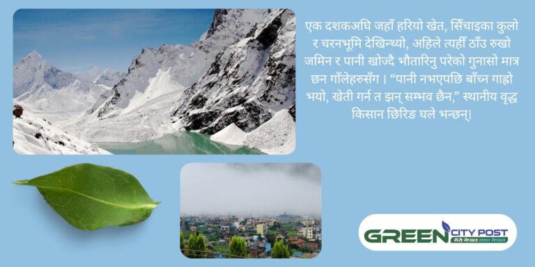 जलवायु विज्ञ डा. भीष्म उप्रेती भन्छन्, “नेपालमा जलवायु परिवर्तनको सबैभन्दा ठूलो प्रभाव अब आर्थिक भन्दा पनि सामाजिक बन्दै गएको छ। गाउँ हराउँदै छन्, मानिसहरू बिस्थापित भइरहेका छन्, र यो प्रक्रिया रोक्ने हो भने स्थानीय स्तरमा पानी स्रोत संरक्षण र जल व्यवस्थापनमा गम्भीर ध्यान दिनुपर्छ।”