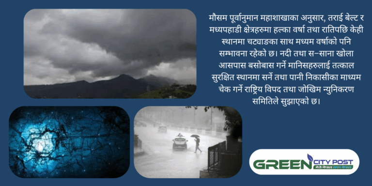 मौसम पूर्वानुमान महाशाखाका अनुसार, तराई बेल्ट र मध्यपहाडी क्षेत्रहरुमा हल्का वर्षा तथा रातिपछि केही स्थानमा चट्याङका साथ मध्यम वर्षाको पनि सम्भावना रहेको छ। नदी तथा स–साना खोला आसपास बसोबास गर्ने मानिसहरुलाई तत्काल सुरक्षित स्थानमा सर्ने तथा पानी निकासीका माध्यम चेक गर्ने राष्ट्रिय विपद तथा जोखिम न्युनिकरण समितिले सुझाएको छ।