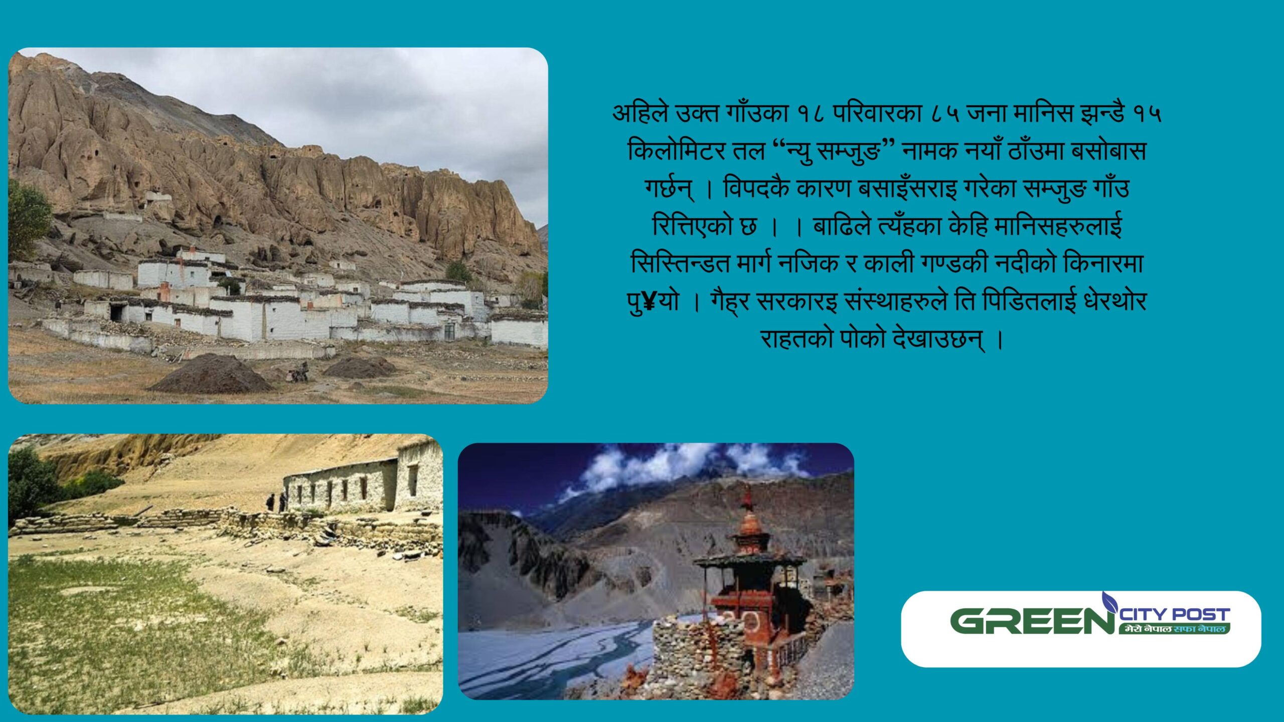 नेपालको समुद्र सतहभन्दा करिब ३,९६२ मिटरमाथिका पहाडहरूमा अवस्थित हिमाली जिल्ला हो मुस्ताङ । प्राचीन समयदेखि मानव बस्दै आएको सम्जुङ गाउँ यतिखेर सुन्य भएको छ । सम्जुङमा महिनौंसम्म पानी नआउँदा त्यँहाका बासिन्दाहरूले आफ्नो तिर्खा बिर्सेर बाँचेका थिए । कुनै उपाय नलागेपछि त्यँहाका स्थानिय बसासराइ गरेर गाँउ छोड्न बाध्य भएका छन् । हिमनदी पग्लँदा पानीका स्रोत सुक्यो…