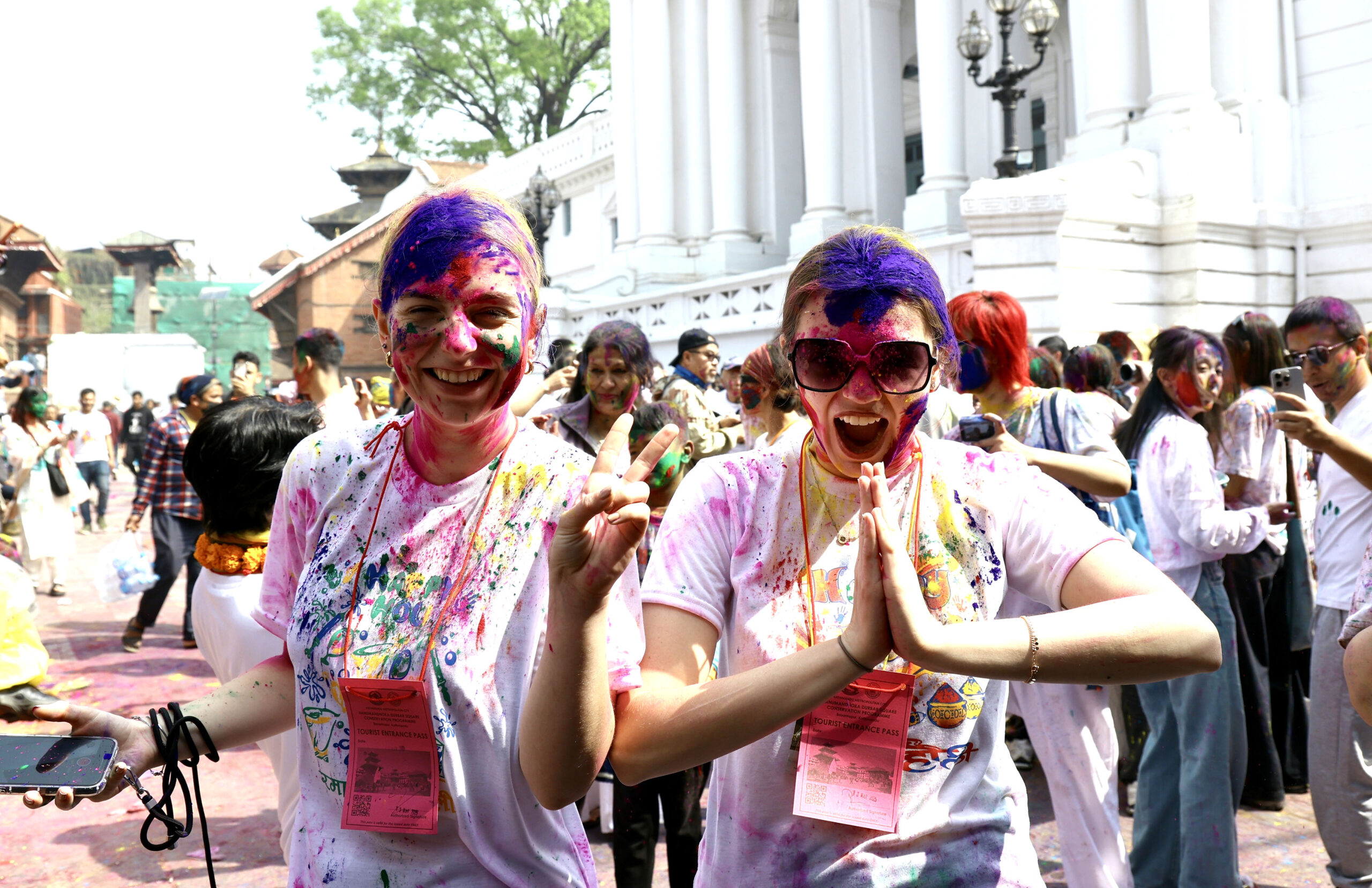 काठमाडौँको बसन्तपुर दरबार क्षेत्रमा होलीमा रमाउँदै विदेशी पर्यटक (तस्बिरहरू)