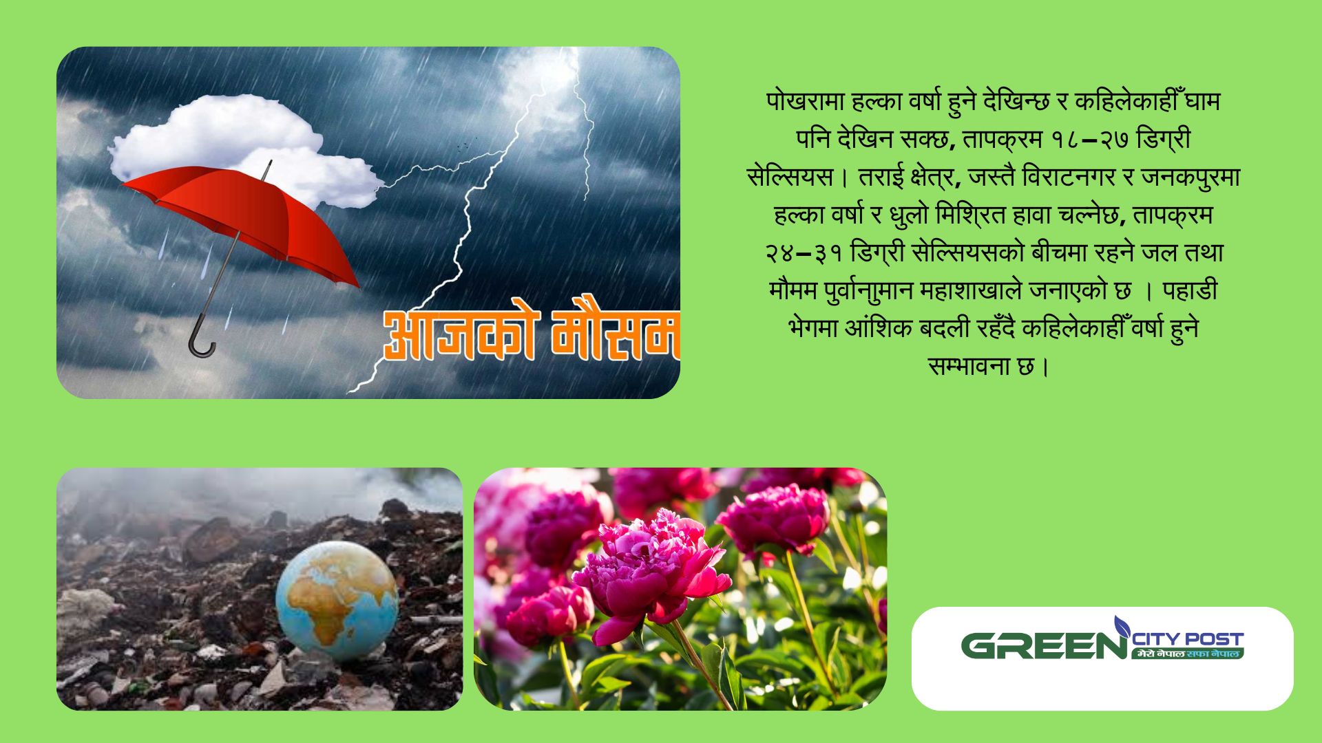 आज काठमाडौं उपत्यकामा दिउँसो आंशिक बदली रहने छ। तापक्रम २० देखि २८ डिग्री सेल्सियसको बीचमा रहने अपेक्षा गरिएको छ। पोखरामा हल्का वर्षा हुने देखिन्छ र कहिलेकाहीँ घाम पनि देखिन सक्छ, तापक्रम १८–२७ डिग्री सेल्सियस। तराई क्षेत्र, जस्तै विराटनगर र जनकपुरमा हल्का वर्षा र धुलो मिश्रित हावा चल्नेछ, तापक्रम २४–३१ डिग्री सेल्सियसको बीचमा रहने जल तथा…